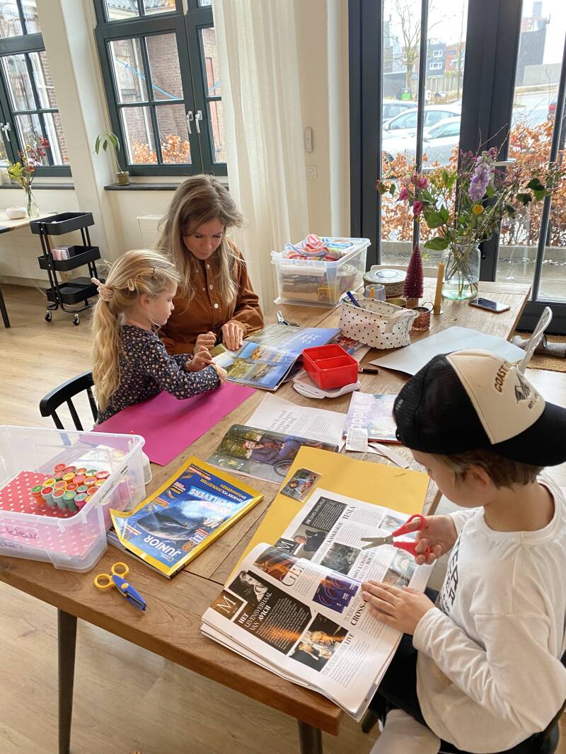 - Tijd om echt aan de slag te gaan. Bij het knippen en plakken bladerden ze lekker door alle magazines heen, ook volwassen tijdschriften deden mee, zodra ze een “jaa gaaf” gevoel of “oh mooi” o.i.d. bij een plaatje voelden moest/mocht het erop. Het kan zijn dat er dan nog weer hele andere dingen boven komen dan je van te voren besproken hebt. Dat geeft niks. Laat los, laat gaan, laat vrij. Dat gesprekje van te voren is alleen maar om ze en beetje warm te laten lopen voor alles waar ze blij van worden en eventueel voor jou als ouder/begeleider om ze een beetje te helpen (herinneren).